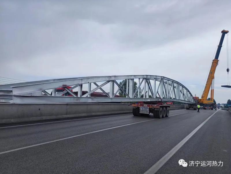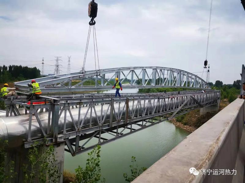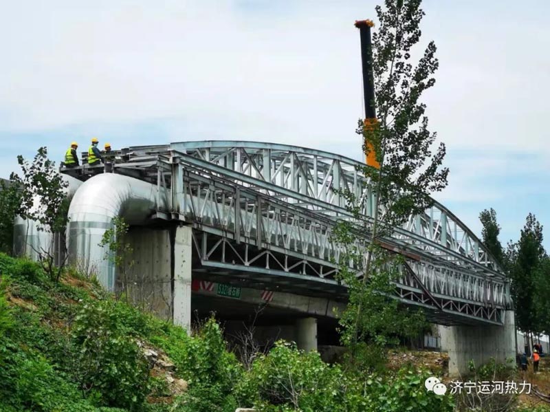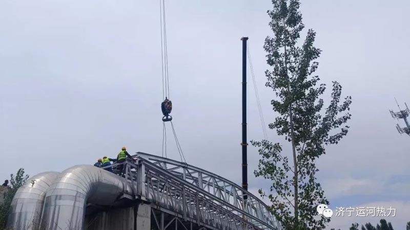 隨著指揮員的一聲哨響,2022年6月14日11點19分,兩部碩大的吊車緩緩放下鋼索,跨度為51米的跨河供熱主管網(wǎng)加固支架順利吊裝完成,這標志著濟寧運河熱力有限公司的跨河DN1200的供熱主管網(wǎng)的安全隱患徹底消除,同時也為濟寧內(nèi)陸主城港區(qū)航道的升級改造掃除了卡脖子工程。