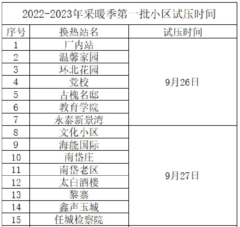 為確保供熱管網(wǎng)安全運(yùn)行,供熱主管網(wǎng)注水試壓工作已于8月20日啟動,供熱系統(tǒng)現(xiàn)已整體具備試壓條件。各小區(qū)的供熱試壓工作將根據(jù)實際情況于9月26日相繼開展。試壓期間個別小區(qū)如因疫情影響不能正常進(jìn)行的,我公司將以公眾號形式另行通知試壓時間。請廣大用戶及時關(guān)注我公司微信公眾號,留意公眾號發(fā)布的信息。同時我公司也將及時與各小區(qū)物業(yè)公司聯(lián)系,確定小區(qū)具體試壓時間,請廣大用戶及時與小區(qū)物業(yè)聯(lián)系或留意物業(yè)公司發(fā)布的相關(guān)信息。