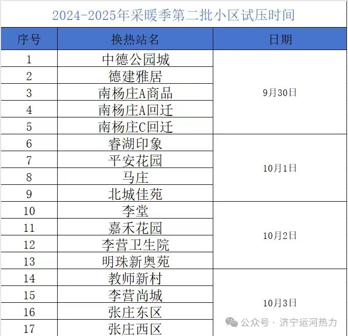 2024-2025年度供暖試壓工作已按計(jì)劃順利開(kāi)展,現(xiàn)將第二批小區(qū)的注水試壓時(shí)間公布,具體情況詳見(jiàn)下表。工作人員將提前一周在各小區(qū)單元樓通知欄張貼試壓通知,請(qǐng)注意查看。試壓期間家中務(wù)必留人,若出現(xiàn)漏水請(qǐng)及時(shí)關(guān)閥處理,避免造成家中財(cái)物損失。